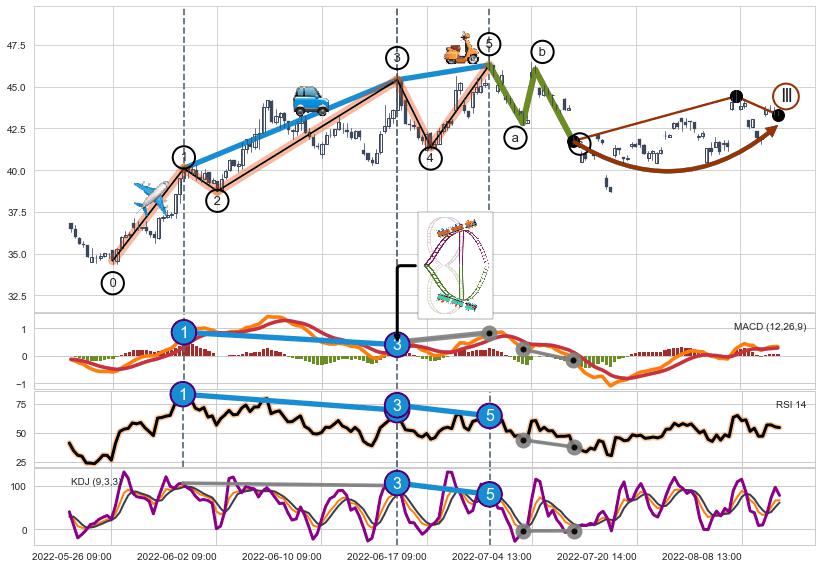 ➢ 1,3,5驱动浪MACD, RSI, KDJ走势都出现【常规背离】反转信号增强