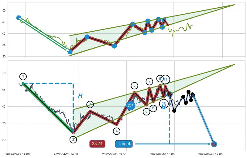 ➢ 最小中继整理跌幅→𝐇: 14.88 (𝐇楔型旗杆的长度:楔型起点→顶点)