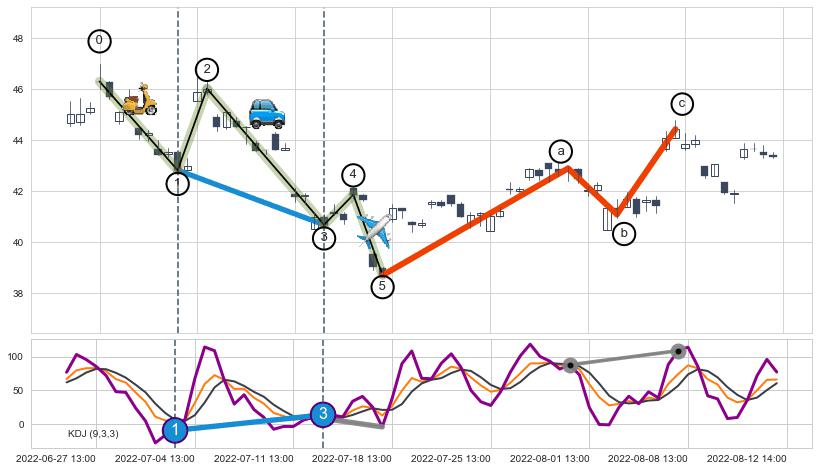 ➢ 第一, 三驱动浪端点:【KDJ】走势出现【常规背离 & 反转信号】背离程度44.14%,背离夹角角度69.4˚,背离程度中等