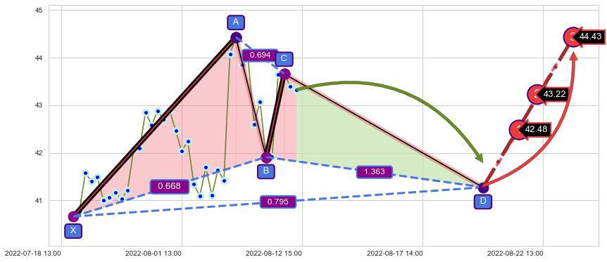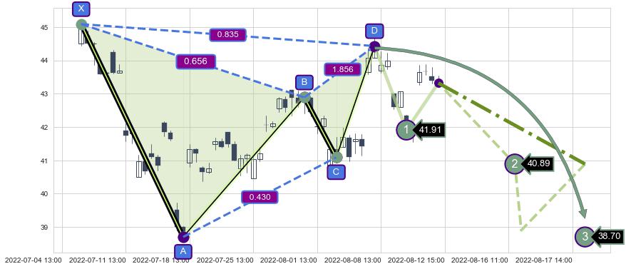 ➣ D点拟合预测价格41.28,距离最后交易收盘价格43.32相差 -4.72%