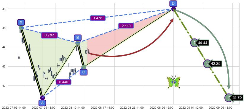 ➣ 未完成【蝴蝶】形态起点X: 07-04:14, 已到达C点: 08-10:13, 预测最终D点: 08-26:15, 共128交易小时
