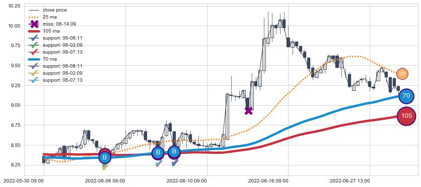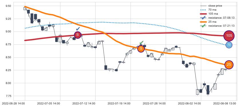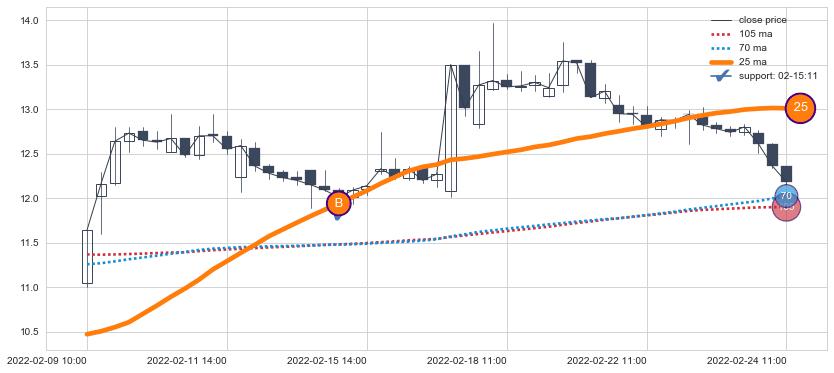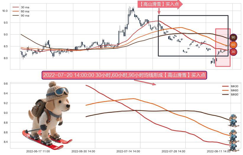 ⚀ 2022-06-28 14:00:00小时-2022-08-11 14:00:00小时显现 30小时-60小时-90小时均线 【高山滑雪】买入点 看多信号,后市看涨,买入