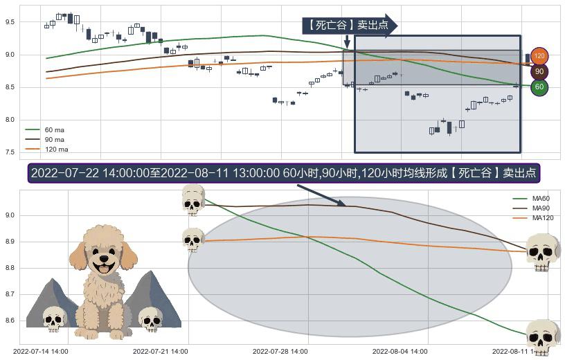 ⚀ 2022-07-25 13:00:00-小时至2022-08-11 13:00:00-小时显现 60小时-90小时-120小时均线 【死亡谷】卖出点 看空信号,后市看跌,卖出