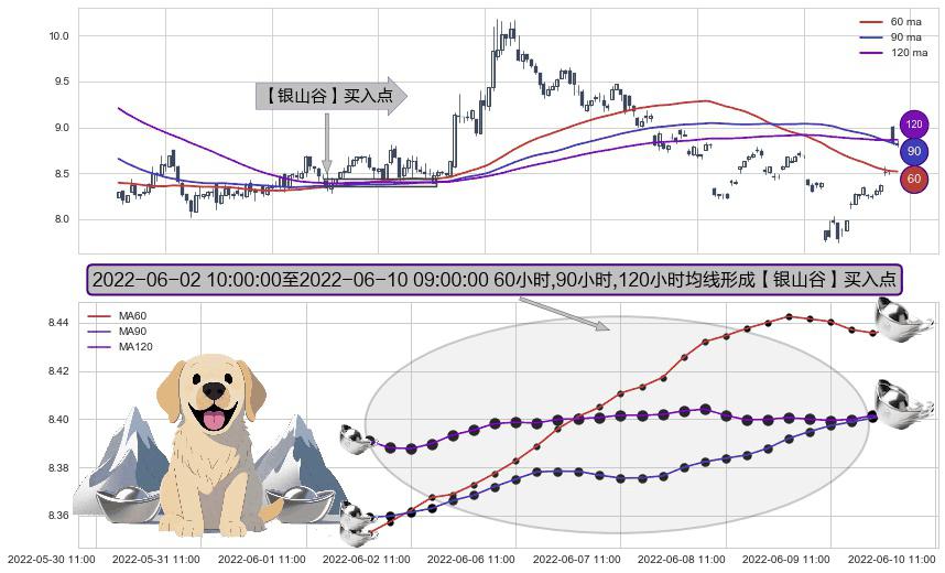 ⚀ 2022-06-02 11:00:00-小时至2022-06-10 09:00:00-小时显现 60小时-90小时-120小时均线 【银山谷】买入点 看多信号,后市看涨,买入