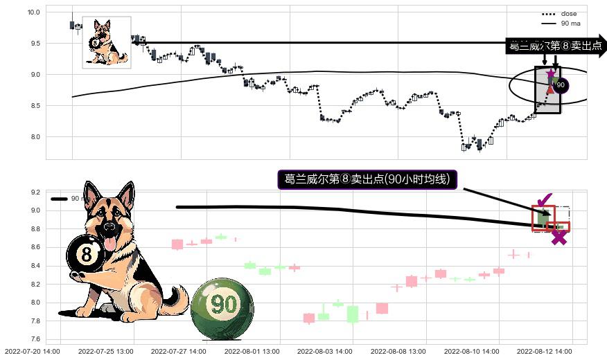 ⚀ 2022-08-12 14:00:00-小时显现 葛兰威尔均线 90小时均线 第⑧卖出点 下降趋势的中继信号,后市看跌,卖出信号
