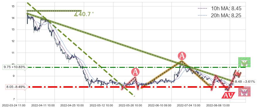 ♘ 支撑价格位8.05,可信任强度97.52%,距离最后交易2022-08-12 14:00形成的收盘价格8.80相差 -8.49%