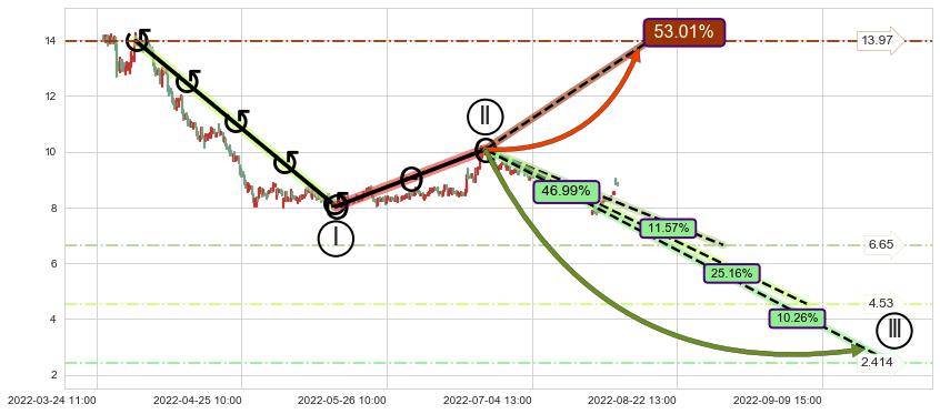 ➣ 调整浪已超过预测的c点位置,但后续大趋势循环浪高概率反转上涨,继续下跌概率46.99%,谨慎做空