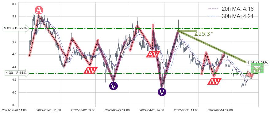 ♞ 20小时均线:4.16,30小时均线:4.21→ 快线<慢线