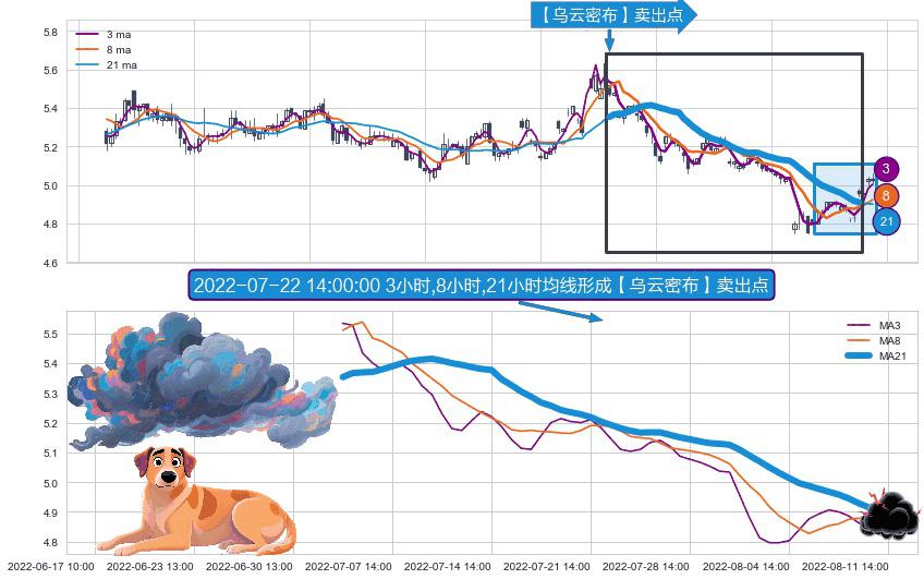 形态多维评估: ⚀ 2022-07-05 13:00:00小时-2022-08-11 13:00:00小时显现 3小时-8小时-21小时均线 【乌云密布】卖出点 看空信号,后市看跌,卖出