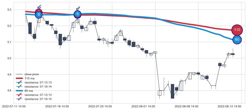 下跌趋势07-11 14:00-08-12 14:00,均线115, 60确认关键阻力2处