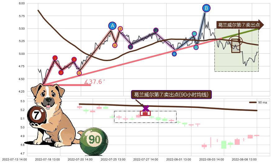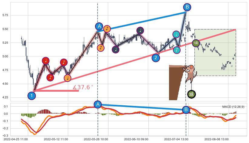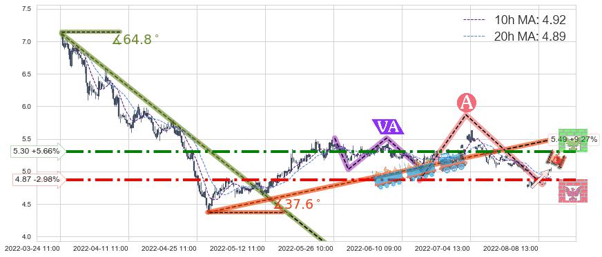 ✂️ 2022-04-27 09:00-2022-07-15 13:00上升趋势存在反转[风险],其原上升趋势的支撑位(5.49)已破位[强阻力信号],原上升趋势角度: 37.6˚