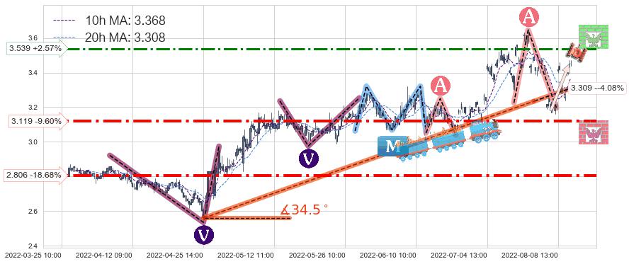 ♘ 阻力价格位3.539,可信任强度57.00%,距离最后交易2022-08-12 14:00形成的收盘价格3.450相差 +2.57%