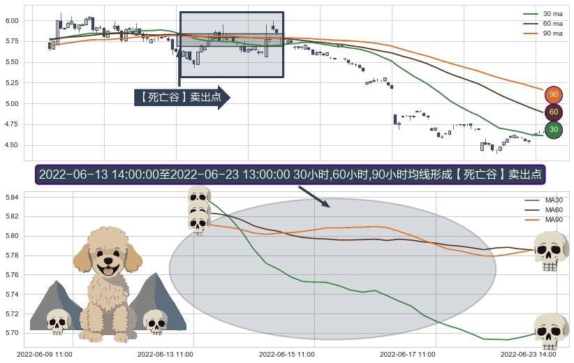 形态多维评估: ⚀ 2022-06-14 09:00:00-小时至2022-06-23 13:00:00-小时显现 30小时-60小时-90小时均线 【死亡谷】卖出点 看空信号,后市看跌,卖出