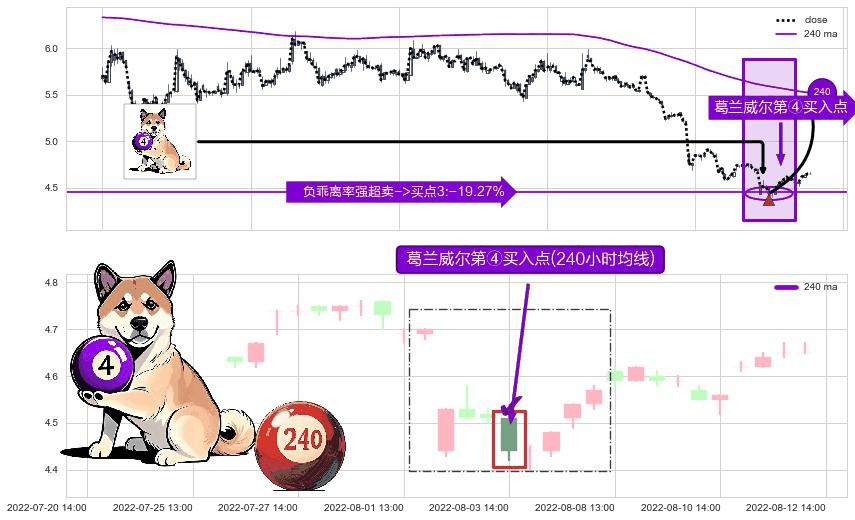 形态多维评估: ⚀ 2022-08-03 14:00:00-小时显现 葛兰威尔均线 240小时均线 第④买入点 下降趋势均值回复的短线反弹信号,后市看涨,买进信号