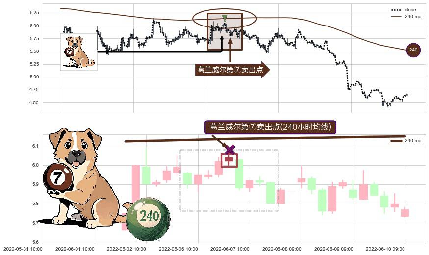 形态多维评估: ⚀ 2022-06-06 14:00:00-小时显现 葛兰威尔均线 240小时均线 第⑦卖出点 下降趋势的中继信号,后市看跌,卖出信号