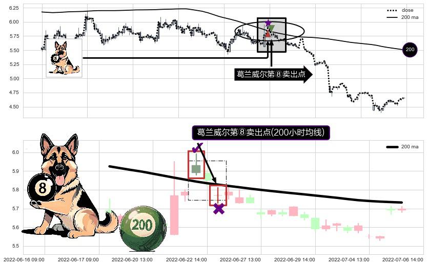 形态多维评估: ⚀ 2022-06-23 13:00:00-小时显现 葛兰威尔均线 200小时均线 第⑧卖出点 下降趋势的中继信号,后市看跌,卖出信号