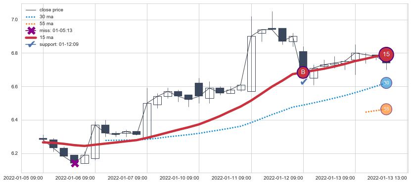 上涨趋势01-05 09:00-01-13 13:00,均线15确认关键支撑1处