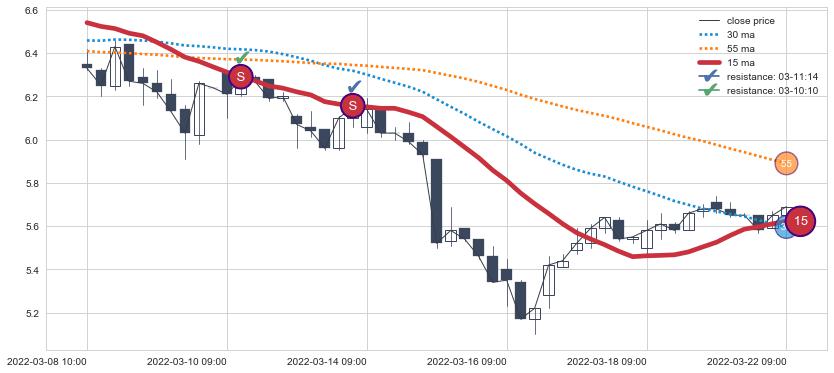 下跌趋势03-08 10:00-03-22 09:00,均线15确认关键阻力2处