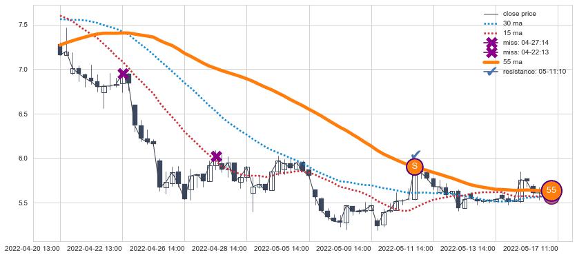 下跌趋势04-20 13:00-05-17 11:00,均线55确认关键阻力1处