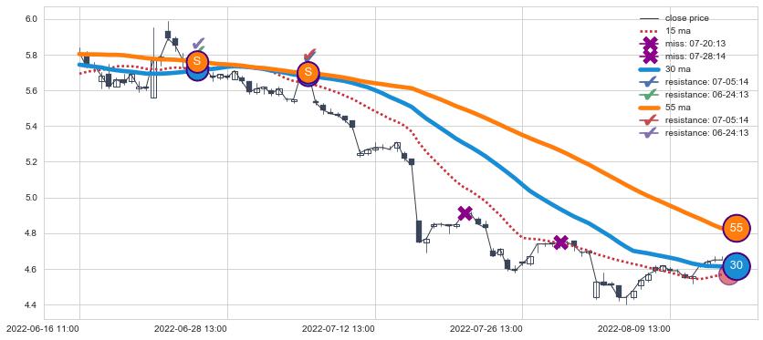 下跌趋势06-16 11:00-08-12 14:00,均线30, 55确认关键阻力2处