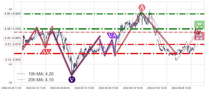 ♘ 阻力价格位4.38,可信任强度90.08%,距离最后交易2022-08-12 14:00形成的收盘价格4.31相差 +1.73%