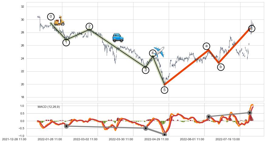 从2022-04-18 11:00至2022-05-23 14:00,共包含113个小时,阶段股价上涨2.73%,阶段股价变动位移路程比: 1 : 32