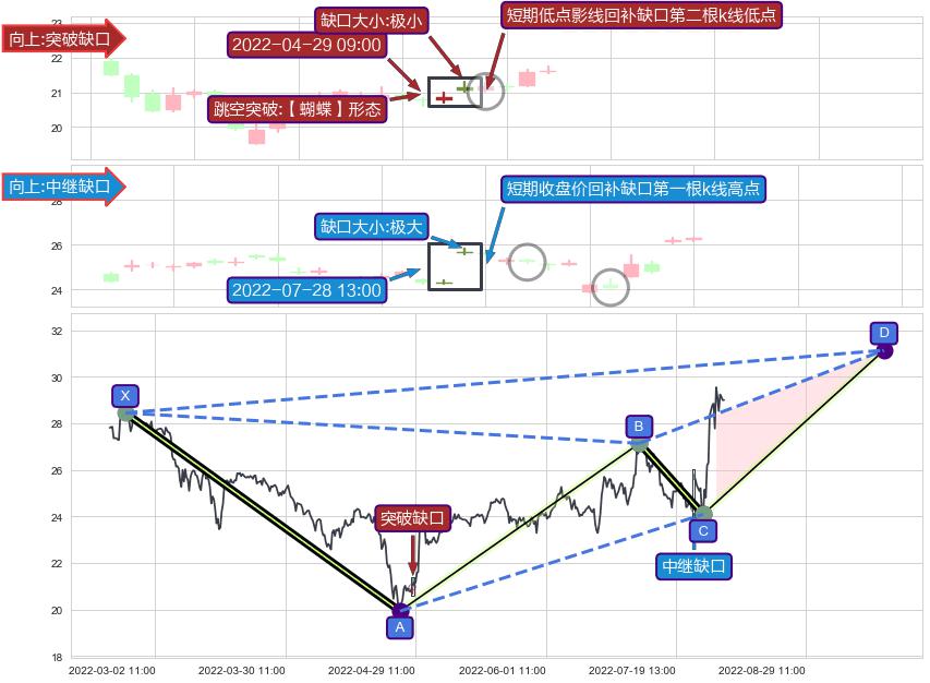 ➣ 突破缺口形成后,后续k已经超过14根,跳空突破【蝴蝶】形态关键点后, 出现【轻微回踩】迹象,短期低点影线回补缺口第二根k线低点