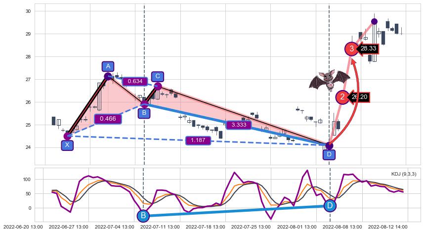 ➣ 已完成【蝙蝠】形态起点X: 06-22:14, 终点D: 08-02:14, 共59交易小时