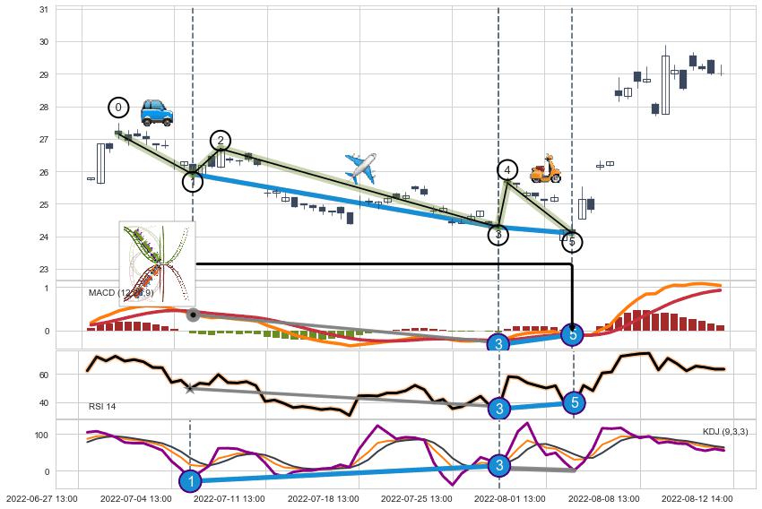 ➢ 1,3,5驱动浪MACD, RSI, KDJ走势都出现【常规背离】反转信号增强