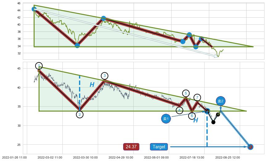 ➢ 【多方力量耗尽,空方打破攻守平衡点】下降三角形中继整理, 已在07-22:13突破【支撑】颈线 33.74 →演变成下降通道