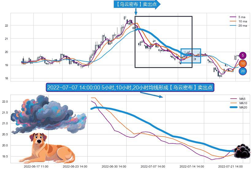 ⚀ 2022-06-24 13:00:00小时-2022-07-21 13:00:00小时显现 5小时-10小时-20小时均线 【乌云密布】卖出点 看空信号,后市看跌,卖出