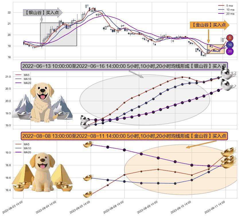 ⚀ 2022-08-08 14:00:00-小时至2022-08-11 14:00:00-小时显现 5小时-10小时-20小时均线 【金山谷】买入点 其再次确认了买入信号,可靠性更强,买入