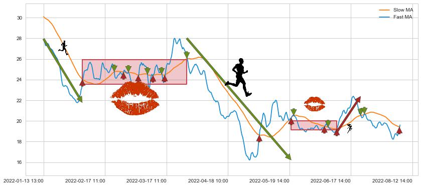 01-13 13:00至02-08 09:00 慢线与快线呈空头排列, 慢线与快线接触少,无缠绕