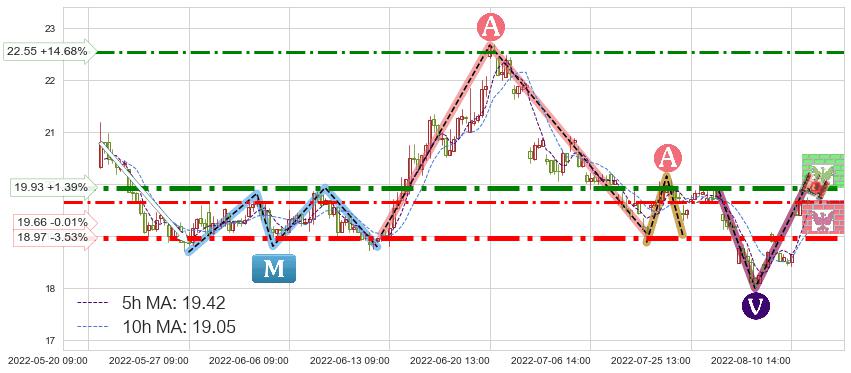♘ 阻力价格位19.93,可信任强度87.53%,距离最后交易2022-08-12 14:00形成的收盘价格19.66相差 +1.39%