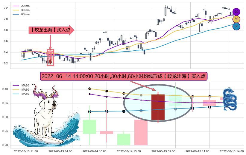 ⚀ 2022-06-14 14:00:00小时显现 20小时-30小时-60小时均线 【蛟龙出海】买入点 看多信号,后市看涨,买入