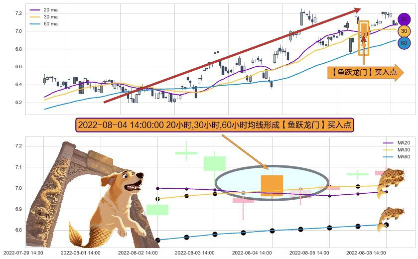 ⚀ 2022-08-04 14:00:00小时显现 20小时-30小时-60小时均线 【鱼跃龙门】买入点 看多信号,后市看涨,买入
