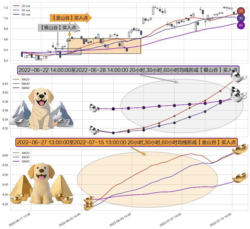 ⚀ 2022-06-27 14:00:00-小时至2022-07-15 13:00:00-小时显现 20小时-30小时-60小时均线 【金山谷】买入点 其再次确认了买入信号,可靠性更强,买入
