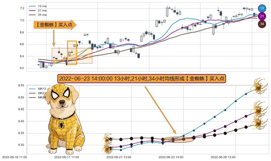 ⚀ 2022-06-23 14:00:00小时显现 13小时-21小时-34小时均线 【金蜘蛛】买入点 看多信号,后市看涨,买入