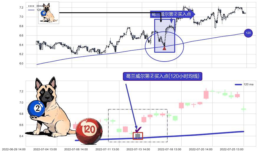 ⚀ 2022-07-12 14:00:00-小时显现 葛兰威尔均线 120小时均线 第②买入点 上升趋势的中继信号,后市看涨,买进信号