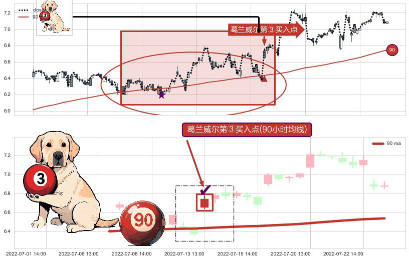 ⚀ 2022-07-13 13:00:00-小时显现 葛兰威尔均线 90小时均线 第③买入点 上升趋势的中继信号,后市看涨,买进信号