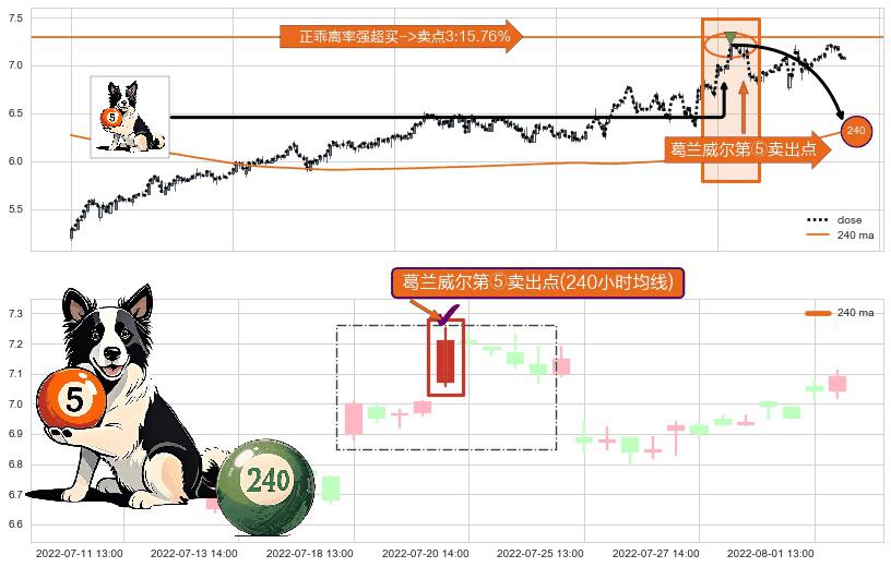 ⚀ 2022-07-20 13:00:00-小时显现 葛兰威尔均线 240小时均线 第⑤卖出点 上升趋势均值回复的短线回落信号,后市看跌,卖出信号
