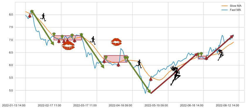 02-11 11:00至03-04 14:00 慢线与快线多次接触,存在上下穿越,有缠绕