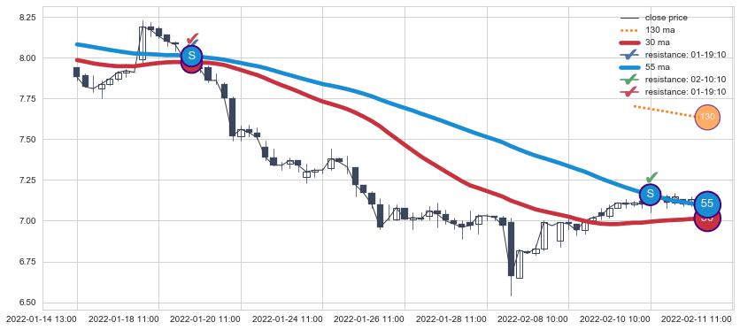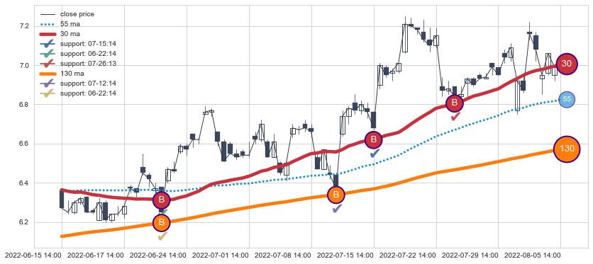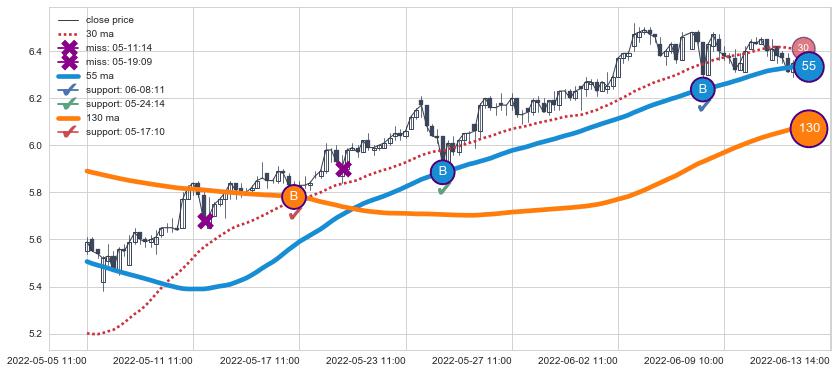 ⚂ 2022-06-14 11:00:00-小时均线向下破位,2022-07-13 13:00:00-小时重新上穿突破均线,均线支撑再次生效