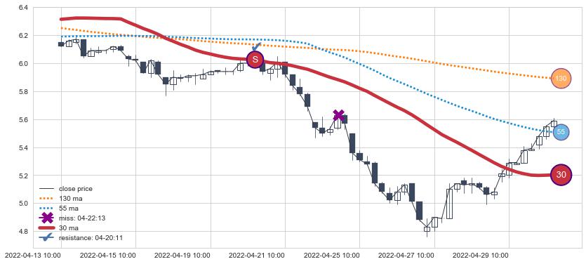 ⚃ 2022-07-20 13:00:00-小时 第⑤卖出点 距离均线【近】距离,均线主动修复向下牵引作用【强】