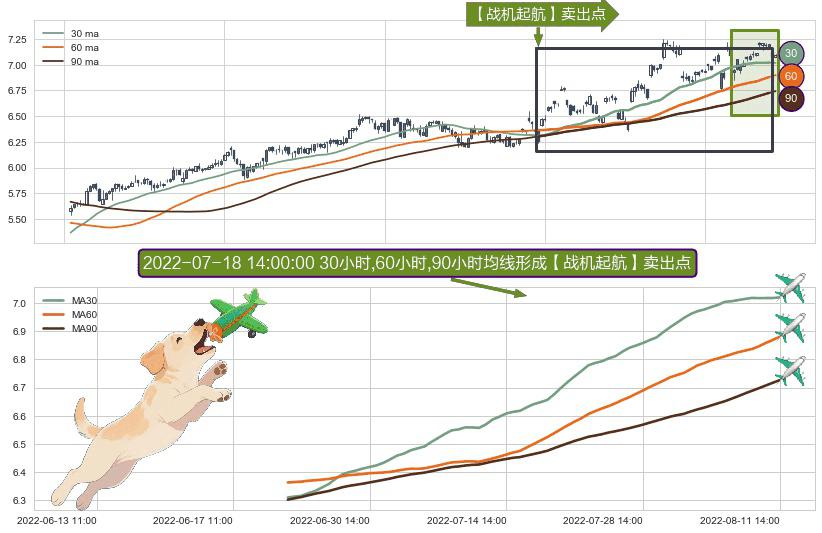 ⚀ 2022-06-22 14:00:00小时-2022-08-11 14:00:00小时显现 30小时-60小时-90小时均线 【战机起航】卖出点 看空信号,后市看跌,卖出