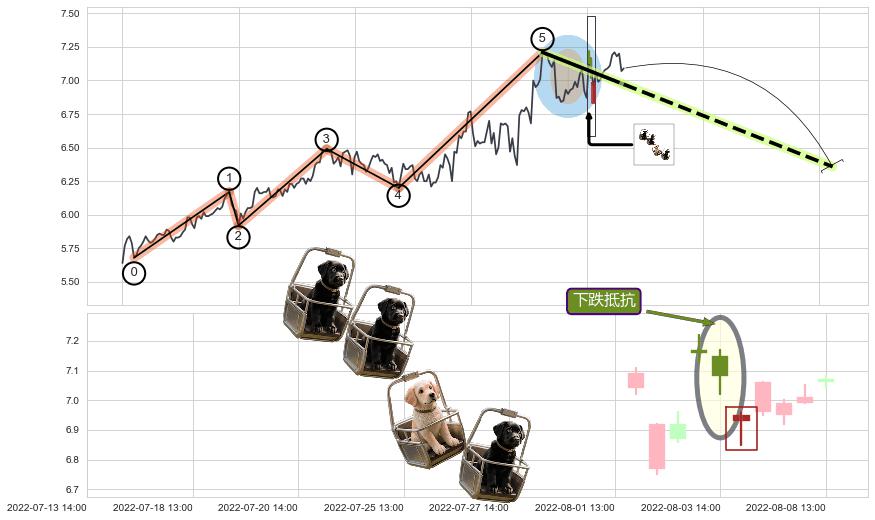 ➢ 高点影线(07-28:13: 6.96 )→回踩→第二根k线高点(07-25:13: 6.94 )