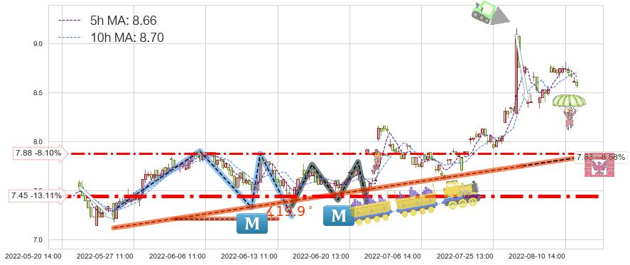 ♘ 支撑价格位7.88,可信任强度68.37%,距离最后交易2022-08-12 14:00形成的收盘价格8.57相差 -8.10%