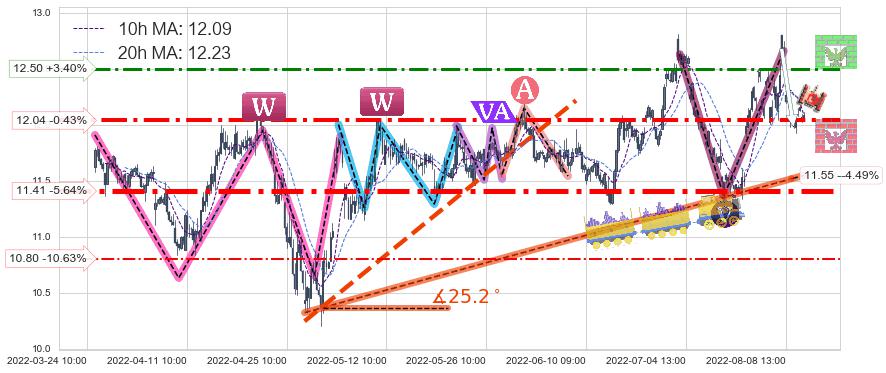 ♘ 阻力价格位12.50,可信任强度64.77%,距离最后交易2022-08-12 14:00形成的收盘价格12.09相差 +3.40%