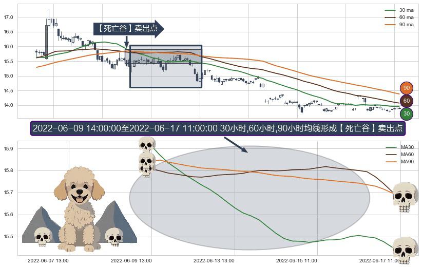 形态多维评估: ⚀ 2022-06-10 09:00:00-小时至2022-06-17 11:00:00-小时显现 30小时-60小时-90小时均线 【死亡谷】卖出点 看空信号,后市看跌,卖出