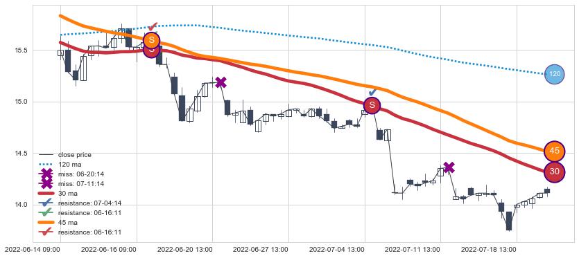下跌趋势06-14 09:00-07-20 13:00,均线45, 30确认关键阻力2处